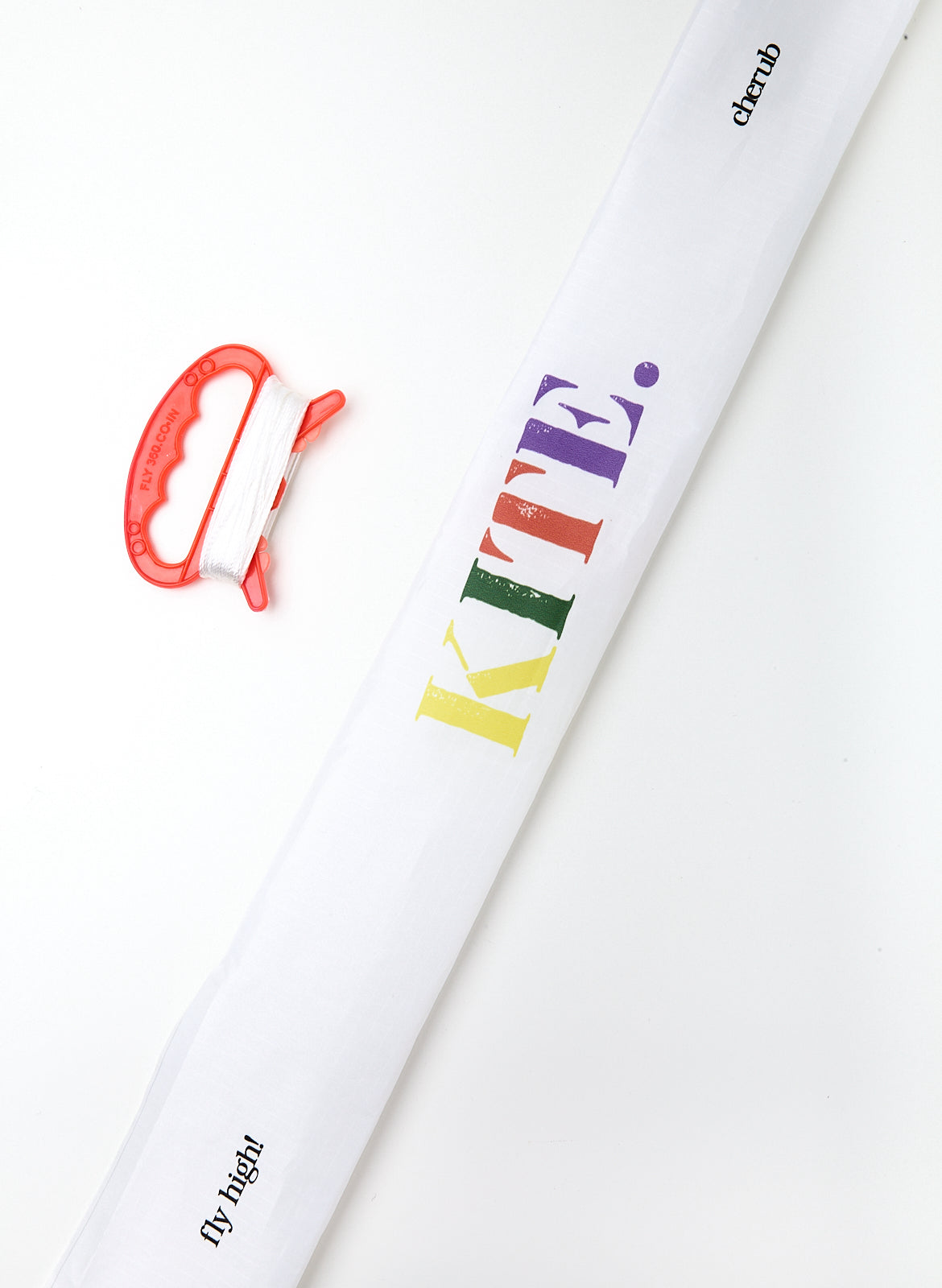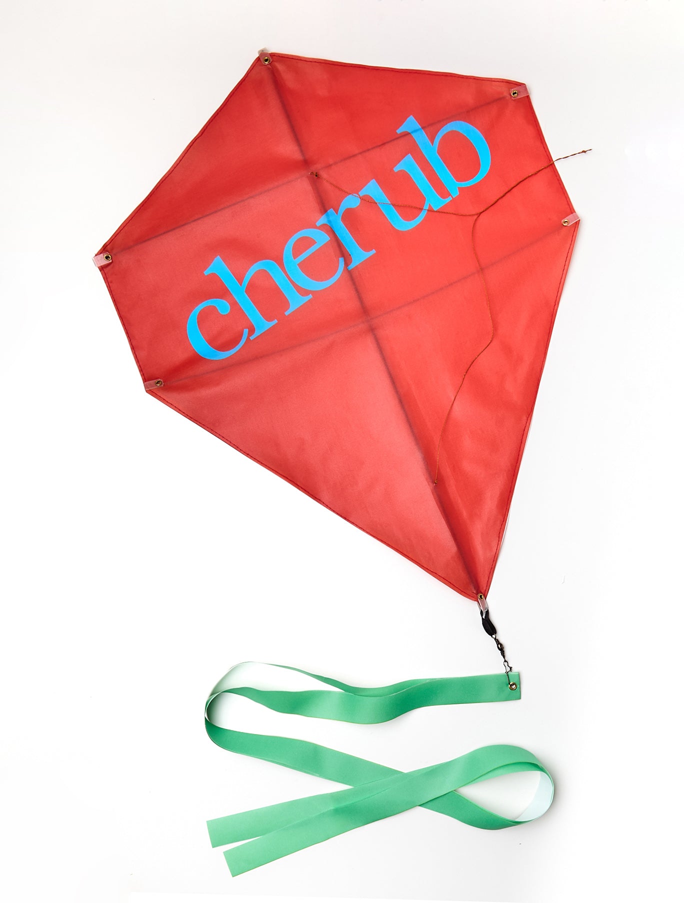 Diamond-shaped kite in bright red nylon, finished with a green satin tail.