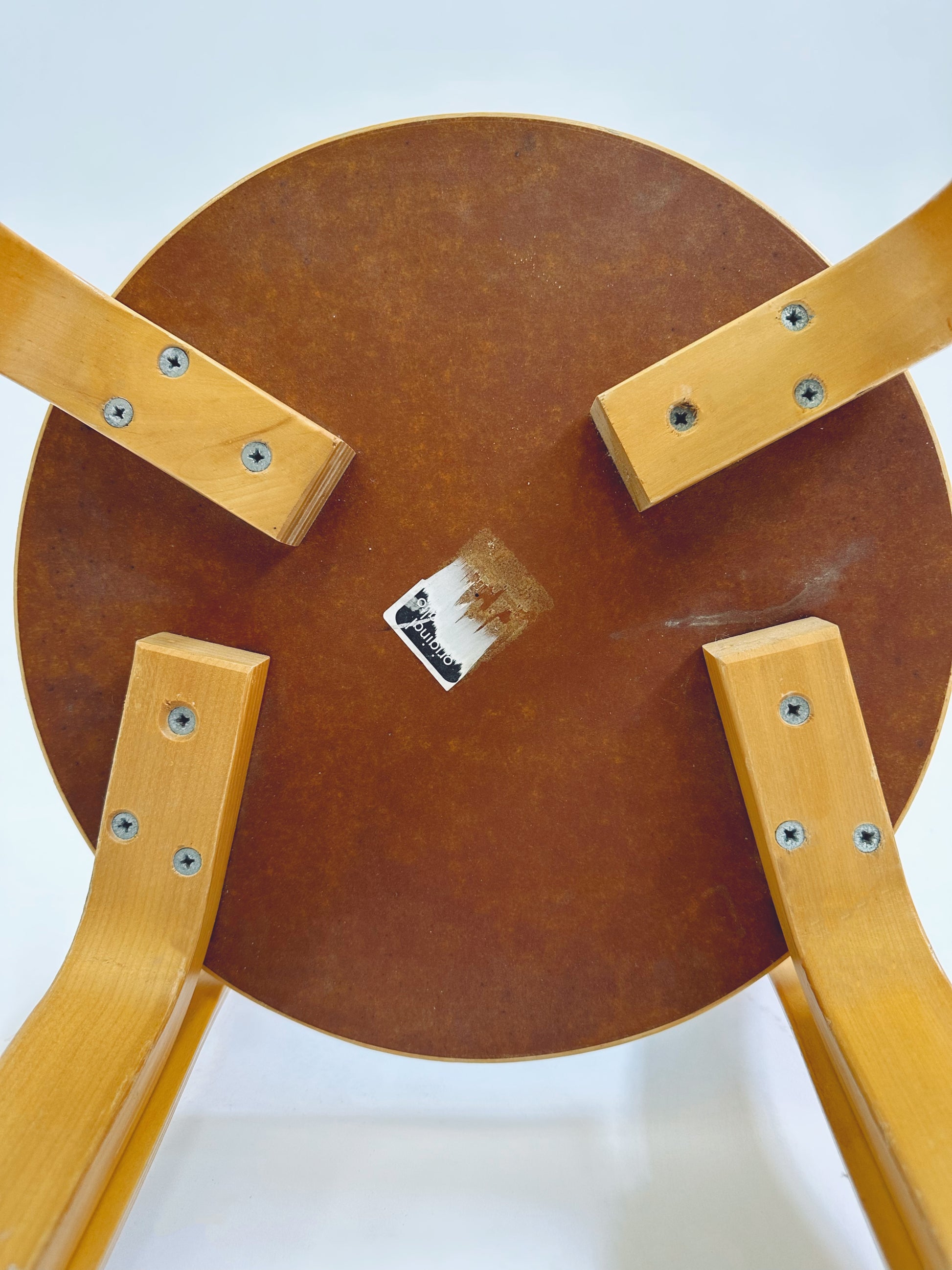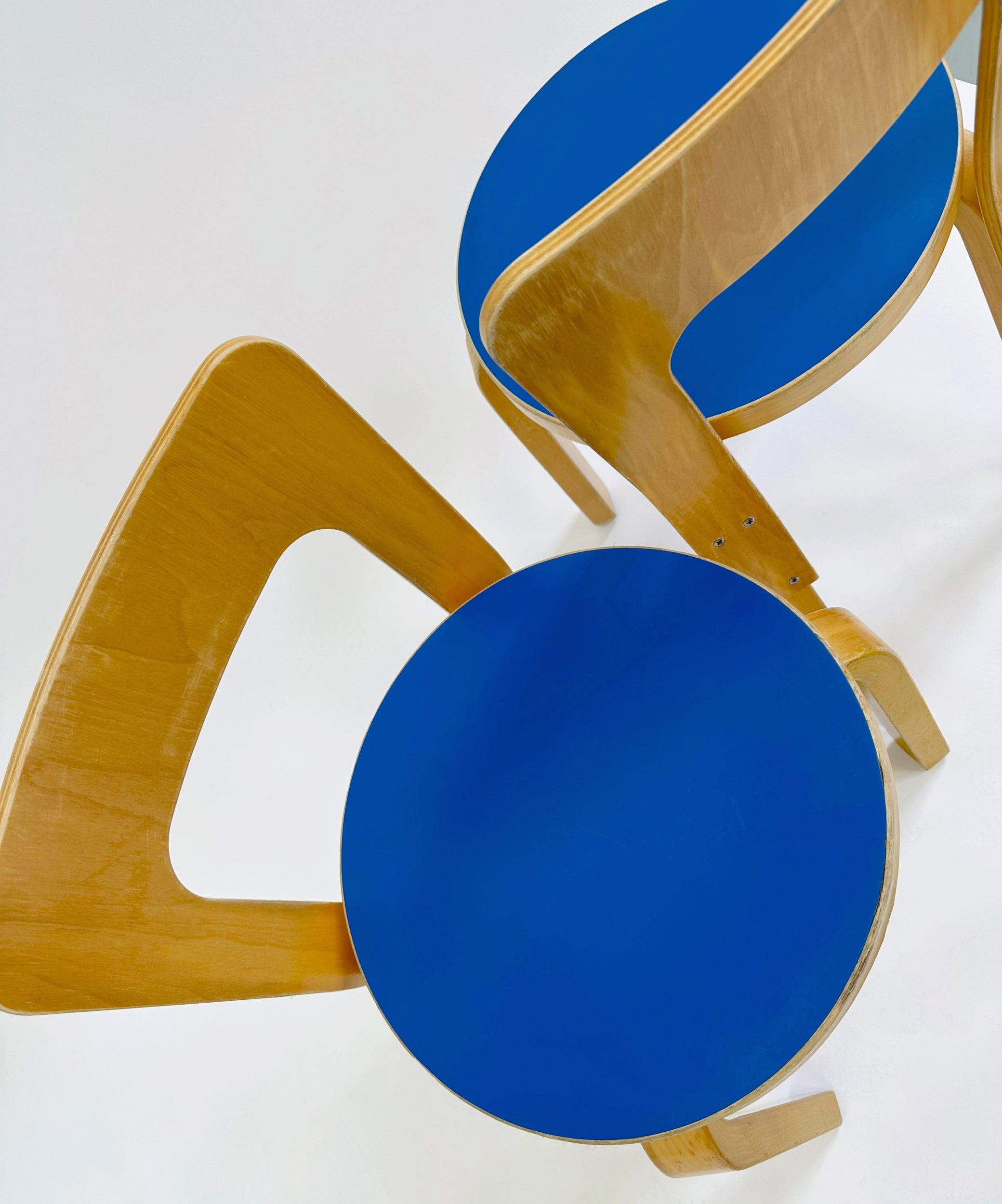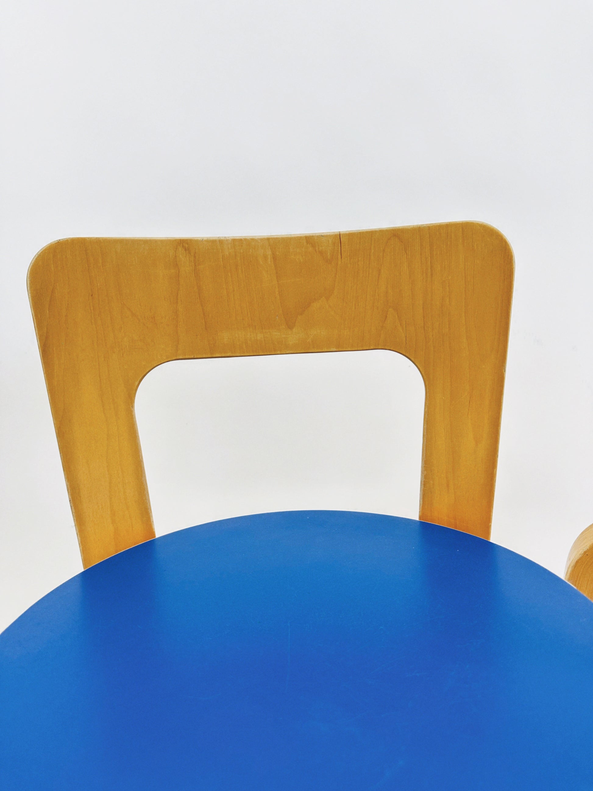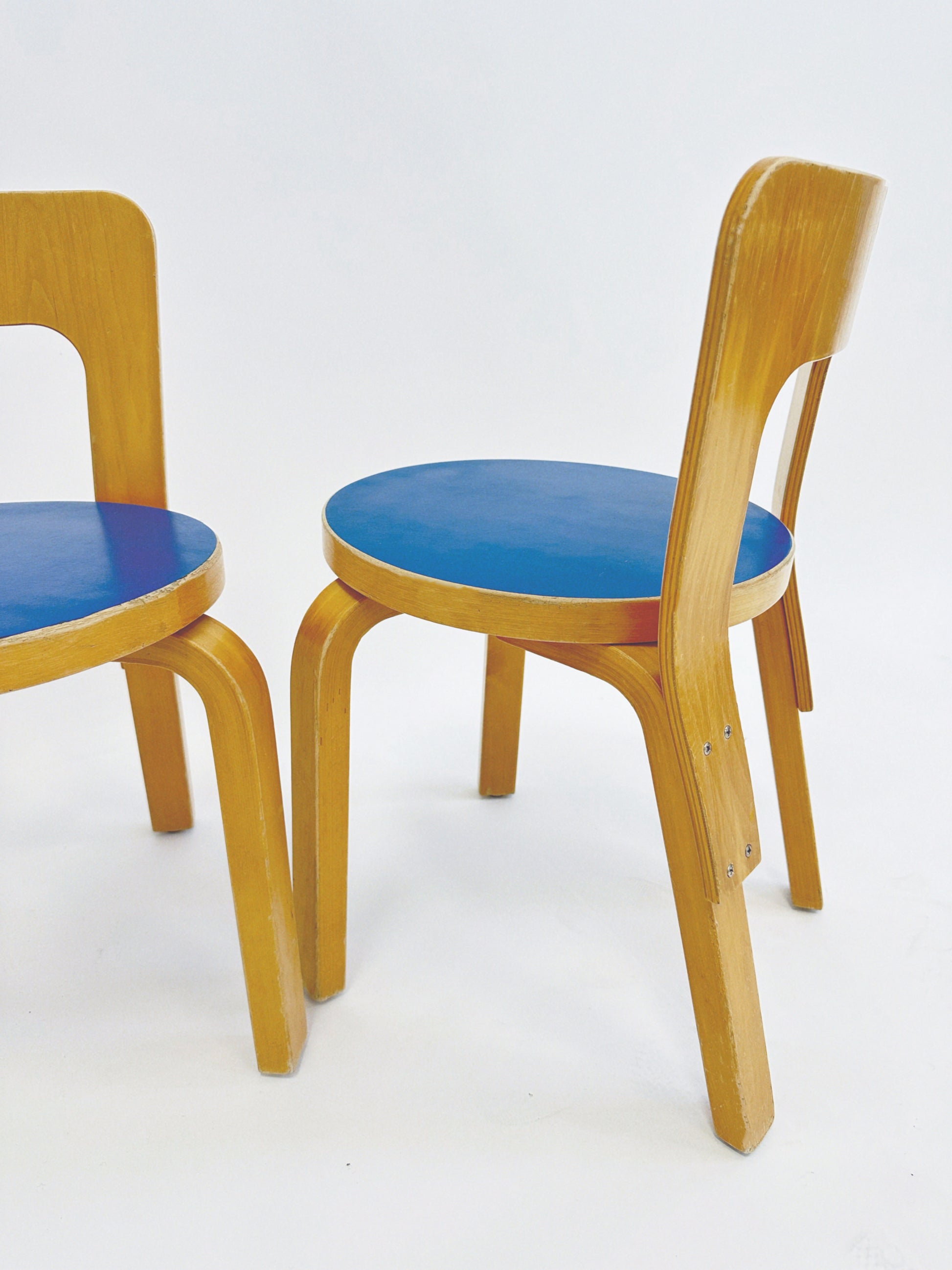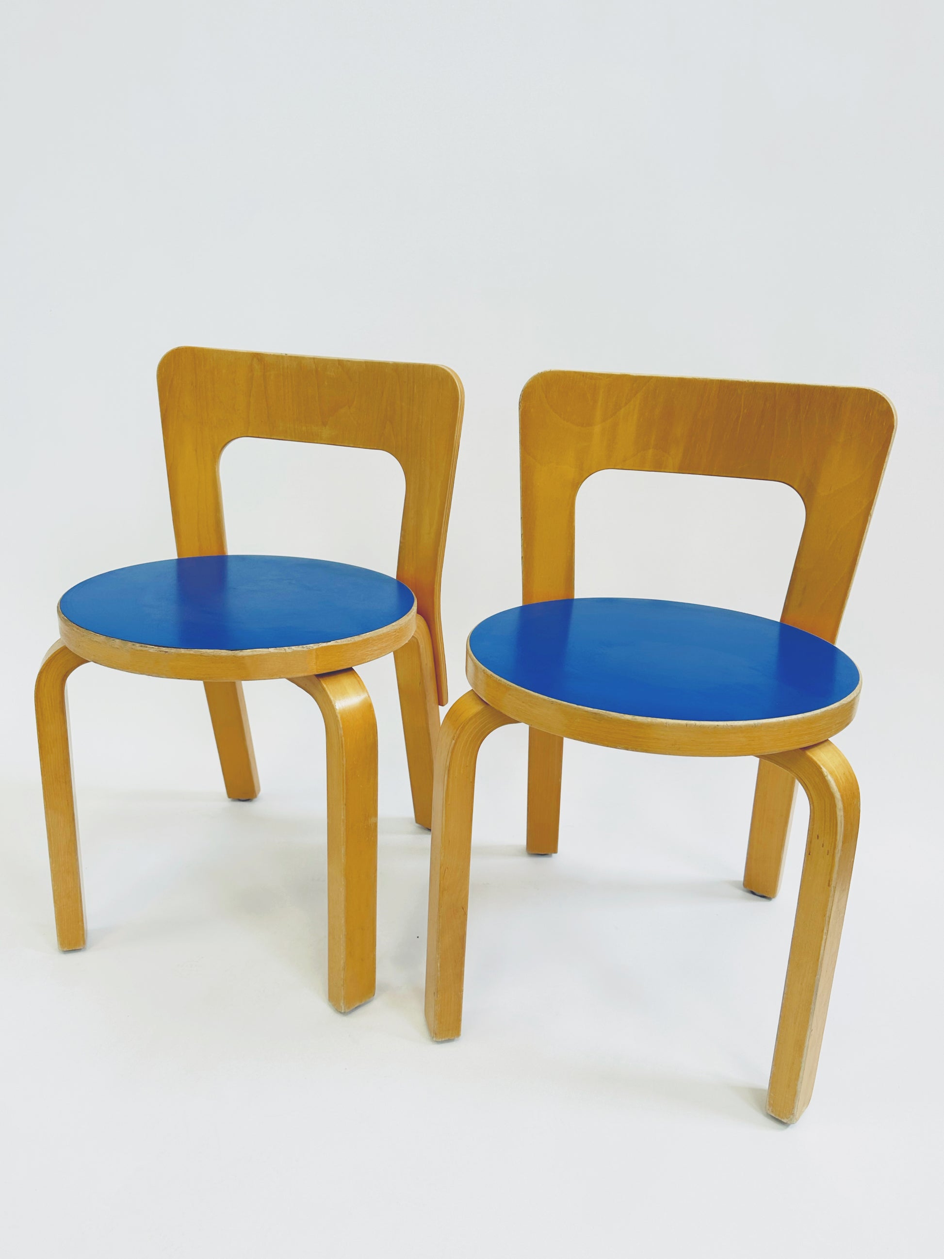 Constructed from bent birch using Aalto’s pioneering L-leg technique, the chair features a curved plywood backrest and circular seat. While the N65 is most commonly found with natural birch or neutral seat finishes, versions with coloured laminate seats—such as this blue example—are less frequently encountered.